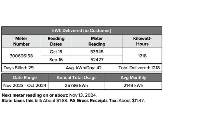 A meter reading calculates energy use in kilowatt hours (kWh) for each billing cycle.