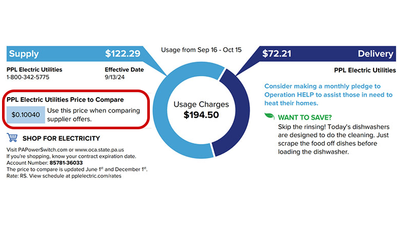 It’s the price you pay for the supply section of your electric bill if you don’t shop for an alternative electric supplier. PPL Electric does not own power plants or generate power. We are required to purchase power on your behalf through a competitive auction process designed to secure the least cost over time, which is passed along without any markup or profit.