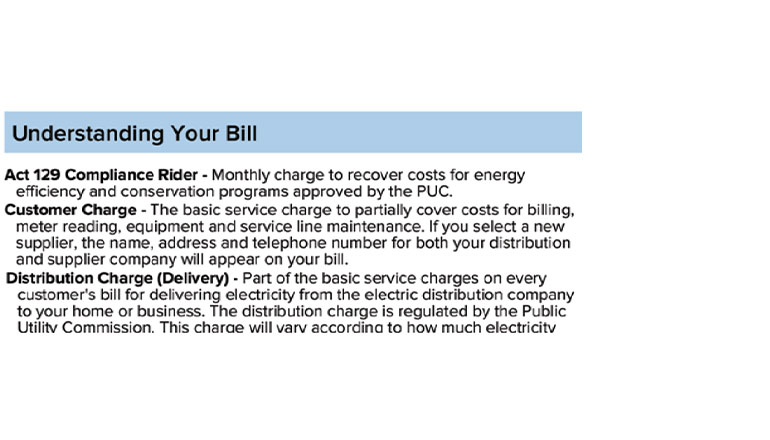 - Energy Efficiency Programs charge – Costs related to energy efficiency and conservation programs that provide rebates and incentives to help customers save energy by the Act 129 law.